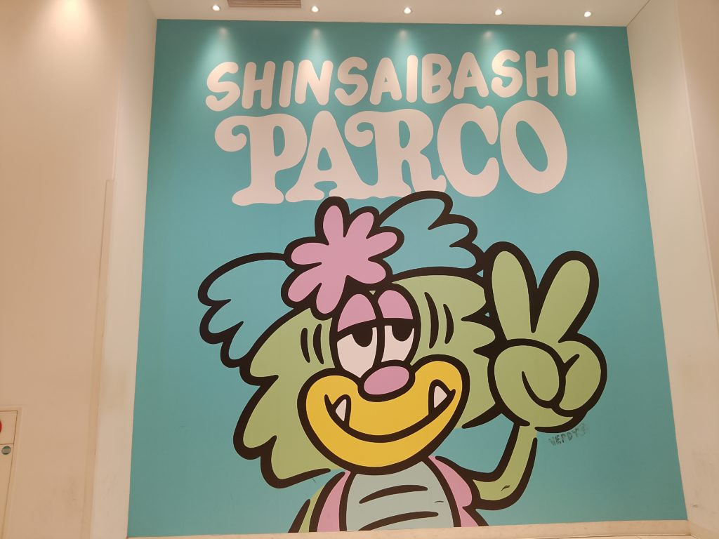 大きく描かれた「SHINSAIBASHI PARCO」のロゴと、ポップでユーモアあふれるキャラクターアートは、思わず写真を撮りたくなる存在感。