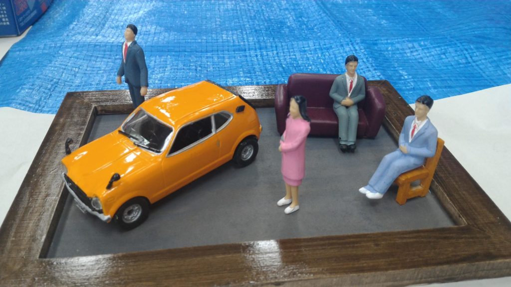 オレンジカーと人物フィギュアを組み合わせたジオラマは、